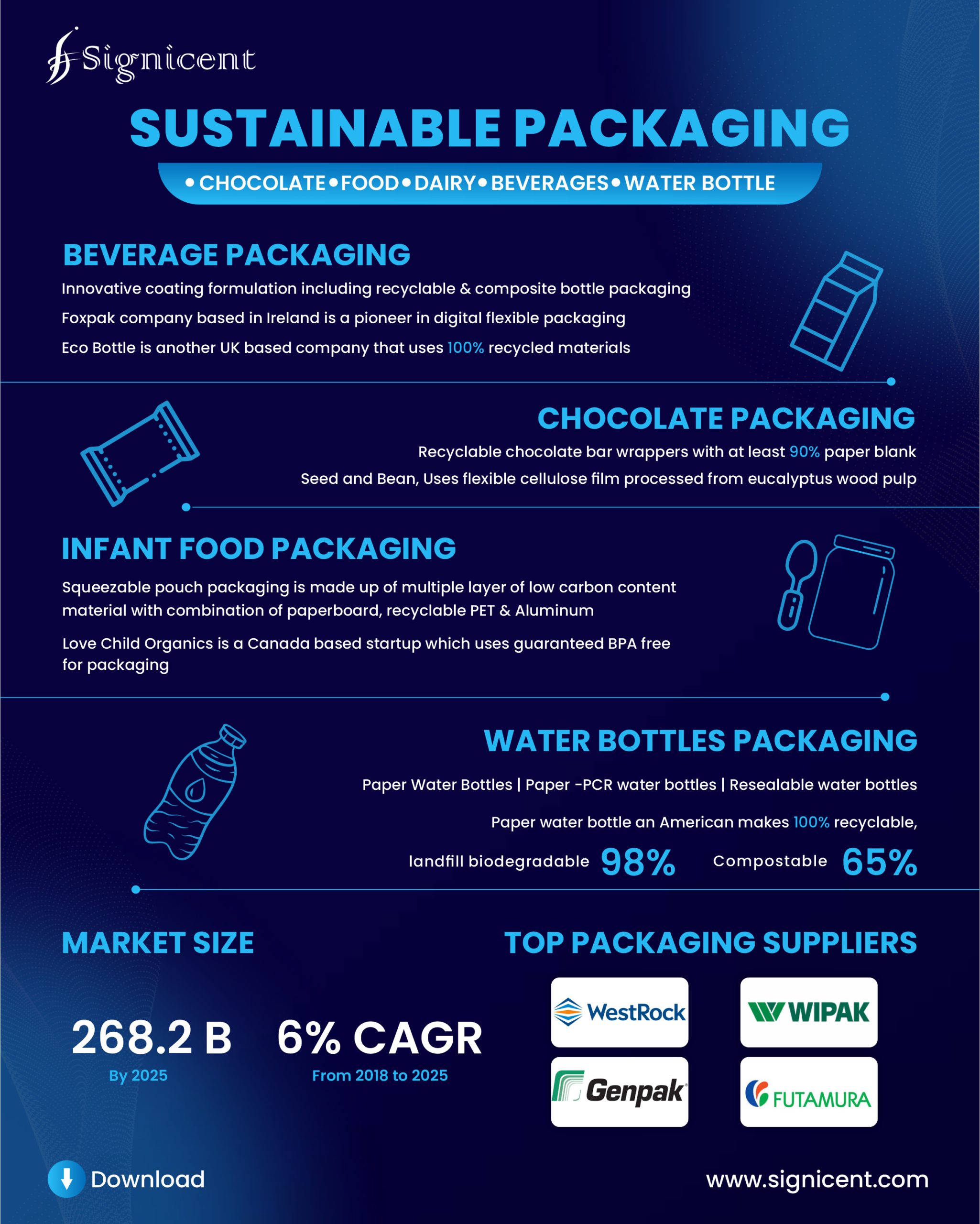 Longer shelf life and food quality are some consumer needs today that have led to the development of food packaging technologies in an era where a zero carbon footprint is the need of the hour to ensure a safer place to live in for our generations to come. It is therefore quintessential today to make consumption of natural resources and sustainability, go hand in hand in order to maintain the ecological balance. The way forward for market growth, collaborations, strategies and innovations in the field is majorly to focus on biodegradable, compostable, recyclable, reusable innovations that are earth-friendly and zero waste generators. The sustainable packaging market size is predicted to succeed at around USD 268.2 billion by 2025 and is anticipated to grow at a CAGR of around 6% from 2018 to 2025. This technology analysis report delivers information on sustainable flexible/ wrapping packaging, problem-solution analysis for an array of industries it serves, key players in the sustainable packaging industry, top packaging suppliers, an overview of some key regulatory authorities along with market analysis of the global market trends across various sustainable packaging types.