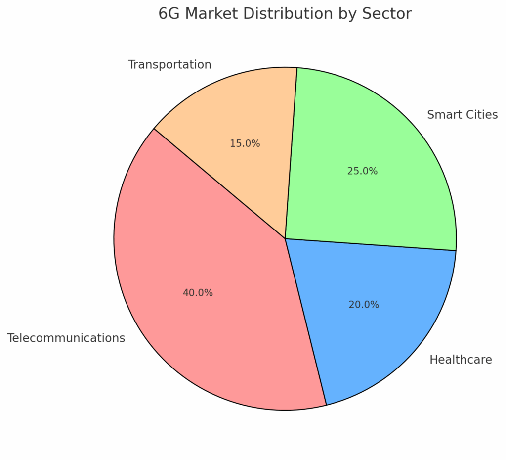 The pie chart highlights the 6G market distribution across key sectors. Telecommunications dominates as the backbone of 6G, driving connectivity and infrastructure advancements. Smart Cities leverage 6G for enhanced urban planning, IoT integration, and real-time data processing. Healthcare benefits from ultra-low latency for telemedicine, remote surgeries, and AI-driven diagnostics. Transportation integrates 6G for autonomous vehicles, smart traffic management, and vehicle-to-everything (V2X) communication, ensuring safer and more efficient mobility solutions.